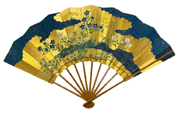 This fan, titled “Azure Blossoms – The Harmony of Gold and Blue,” features a radiant gold background adorned with flowing blue clouds and blooming bellflowers (kikyō) — a design that evokes the serenity of nature and the elegance of Japanese classical art.