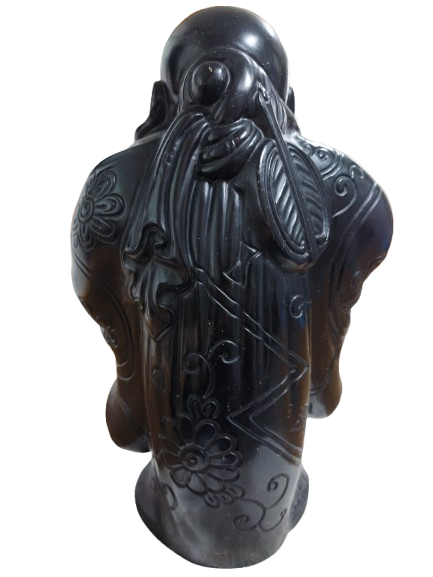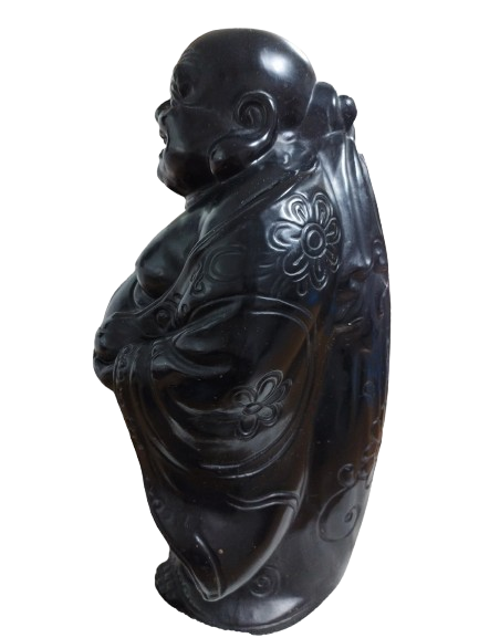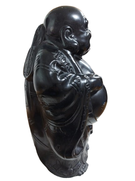 This elegant Black Laughing Buddha statue, approximately 35 cm in height, represents happiness, prosperity, and protection.
