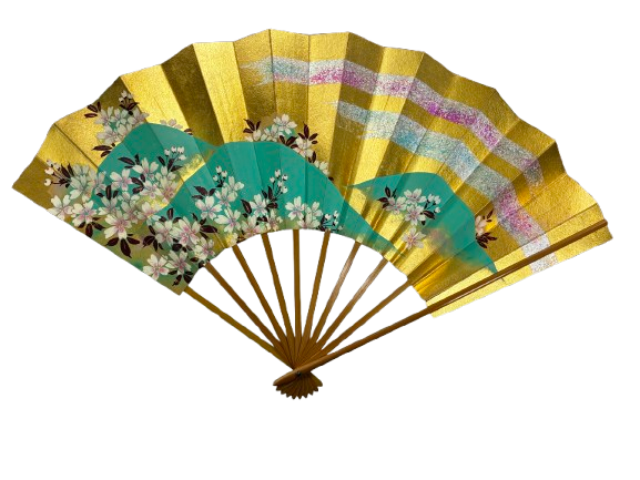 This exquisite fan, titled “Golden Breeze – Blossoms over Emerald Hills,” features a luminous gold-leaf background adorned with white cherry blossoms blooming over emerald-green rolling hills.