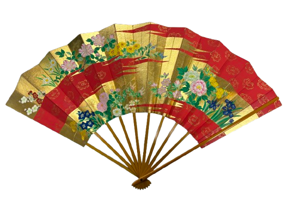 A radiant Kyoto fan by Jumatsuya Fukui — vivid flowers of four seasons bloom across gold and crimson harmony.