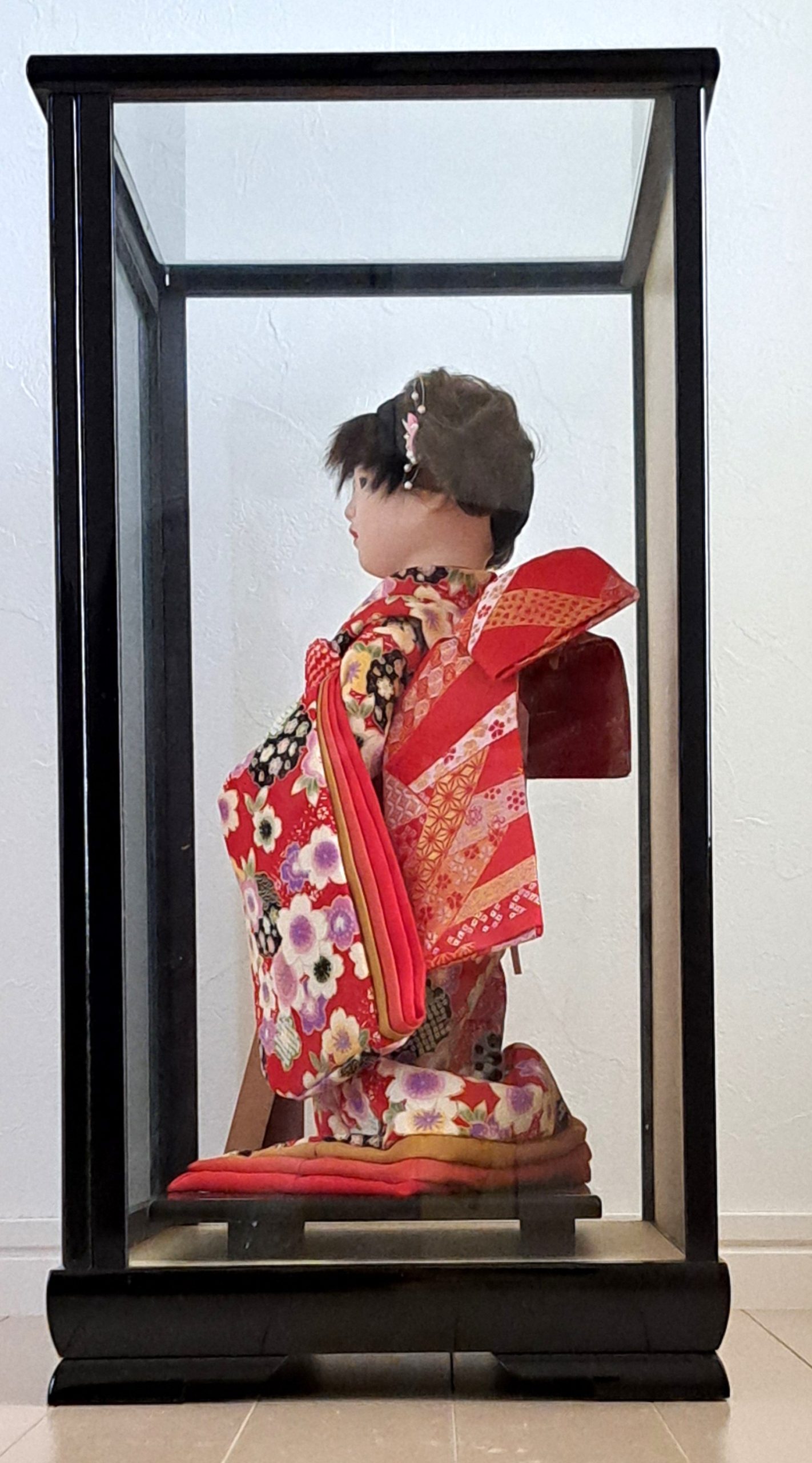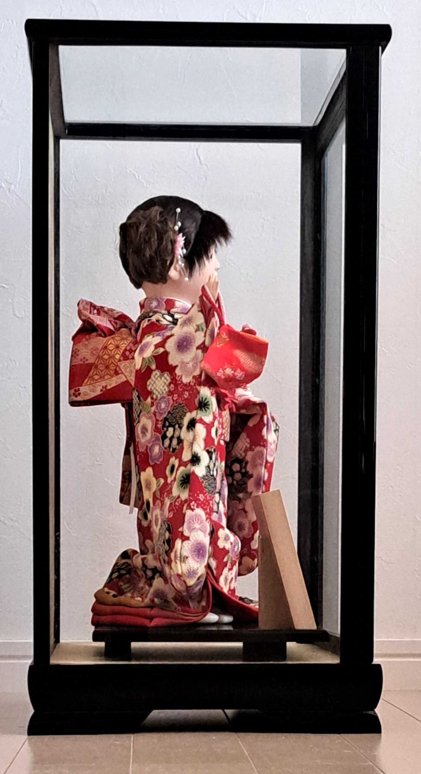 Material: Go-fun lacquer, silk kimono, glass eyes, wood, fabric, glass display case