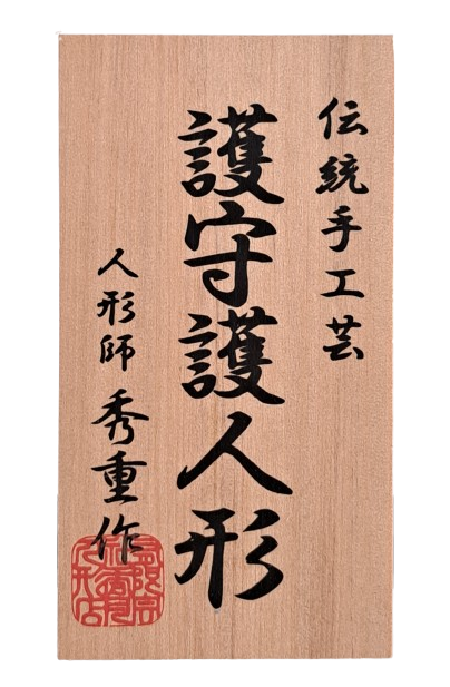 A charming “Guardian Doll of Blessing” (護守護人形), meticulously handcrafted by Master Hideshige (秀重作), a skilled Japanese doll artisan celebrated for preserving traditional handcraft techniques (Dentō Shukōgei).