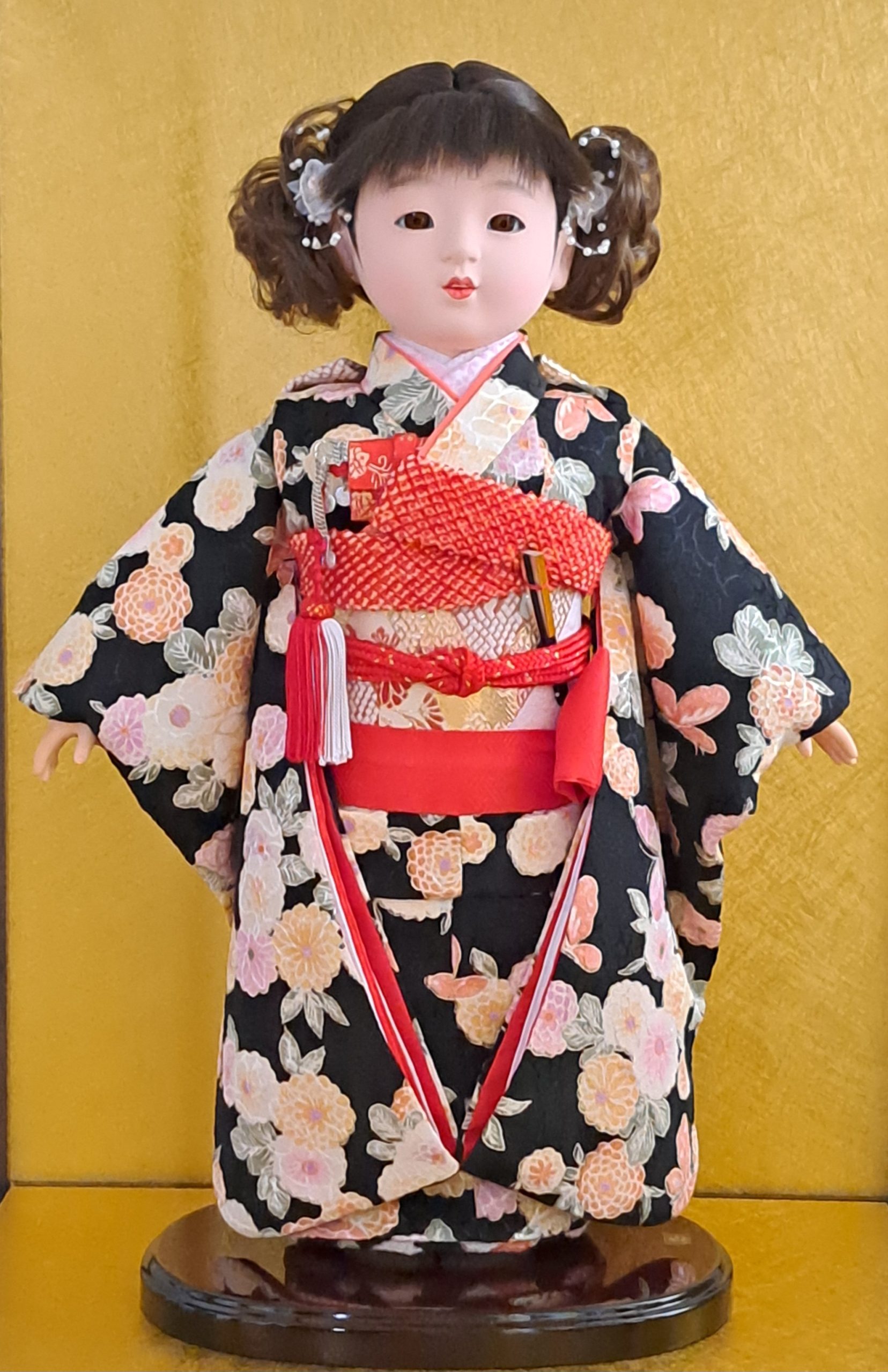 This piece, titled “Yuzen Chrysanthemums and Butterflies”, features a charming girl doll dressed in an elegant black kimono adorned with soft pink and gold chrysanthemum motifs, symbolizing longevity and beauty. The obi (sash) is woven in gold brocade, complemented by a red obi-jime and tassels, creating a delicate yet noble harmony.
