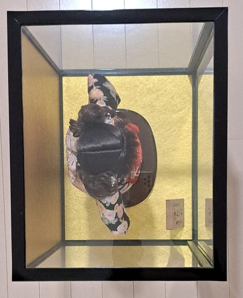 Materials: Go-fun (crushed oyster shell lacquer), silk kimono, wood, glass case