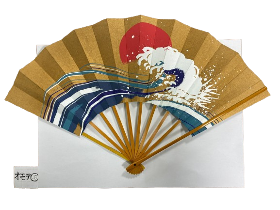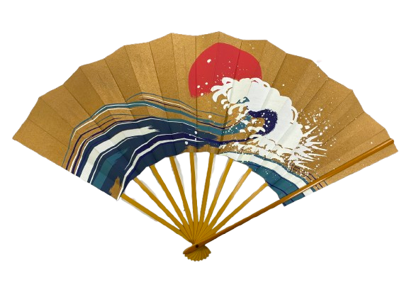 A breathtaking gold folding fan that captures the essence of Japan’s natural beauty — the crimson rising sun over a majestic ocean wave, inspired by the timeless style of Katsushika Hokusai.