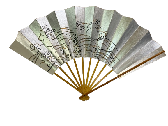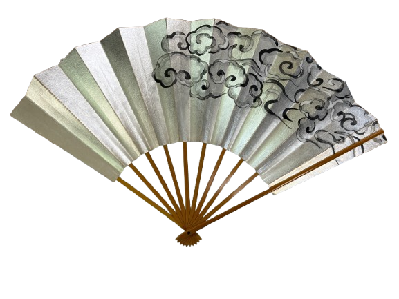 Silver Japanese fan with wave and cloud motifs – elegant Kyoto craftsmanship in shimmering metallic tones.